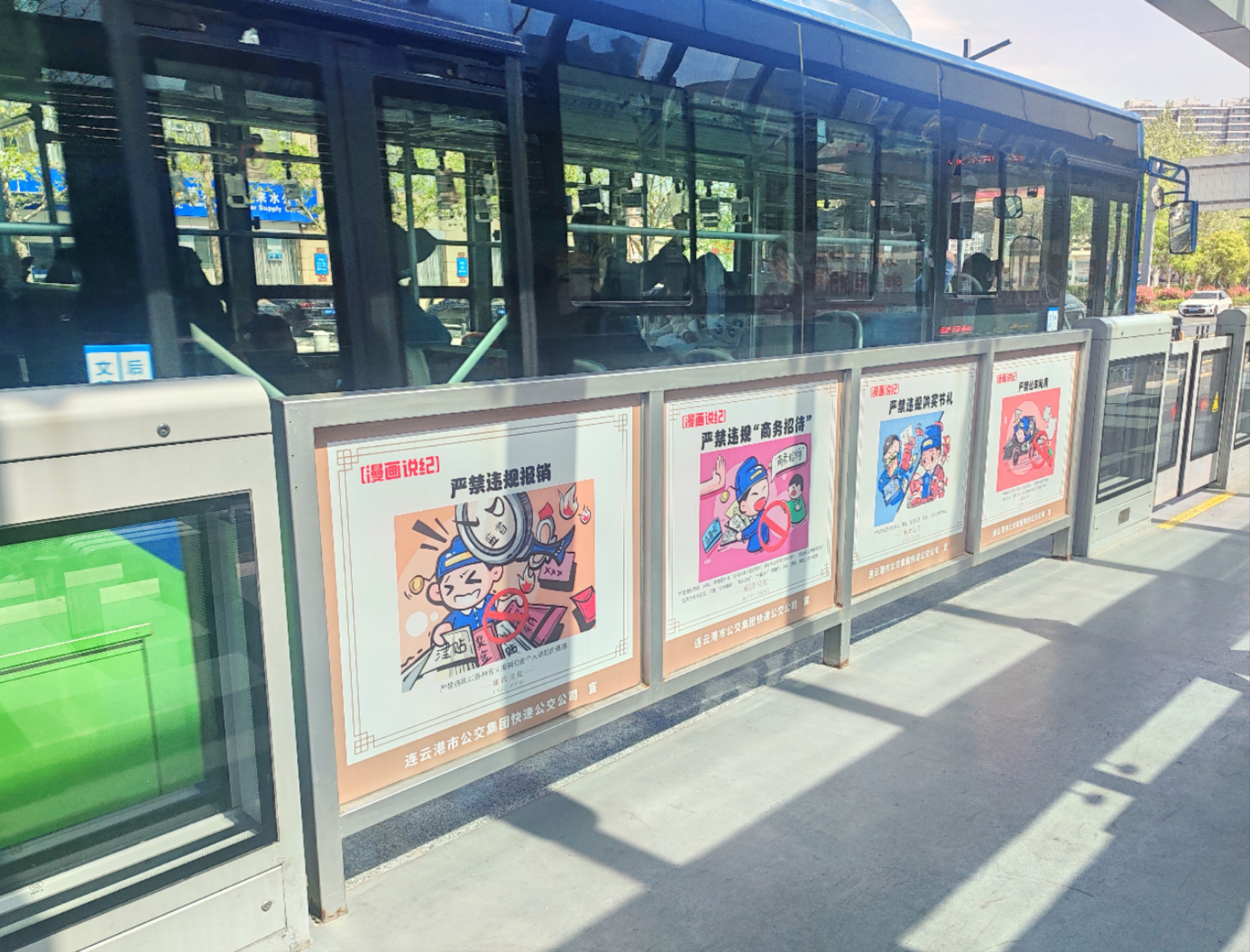 为扎实推进廉洁公交建设,让清廉文化深入基层、直达民心,市交通控股公交集团结合廉洁文化教育月活动,于4月16日在brt起点站海州客运站及大客流站台自来水公司站的安全门上张贴了廉洁漫画,将漫画元素融入站台,使公交站台成为城市文明与廉洁文化宣传的双重窗口。
